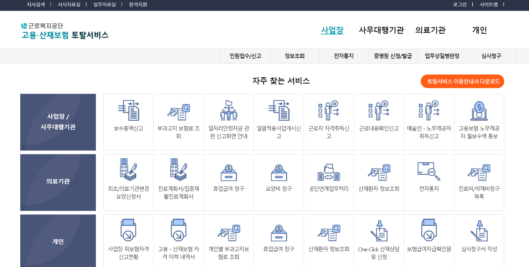 2) 고용산재 토탈서비스 홈페이지 접속후 첫화면 하단 좌측에서 두번째 메뉴를 보면 고용산재보험 자격이력내역서에 접속한다.