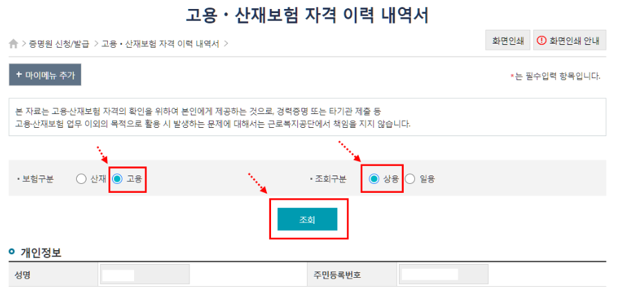4) 로그인후 고용보험자격이력확인 또는 조회를 한다. 고용보험에 가입이 되어있다면 개인정보와 함께 상세 이력 확인과 이력 내역서도 발급받을수있다. 만약 나오지 않으면 가입이 아직 안된거라 사업장에 얘기해서 가입을 진행해야한다.