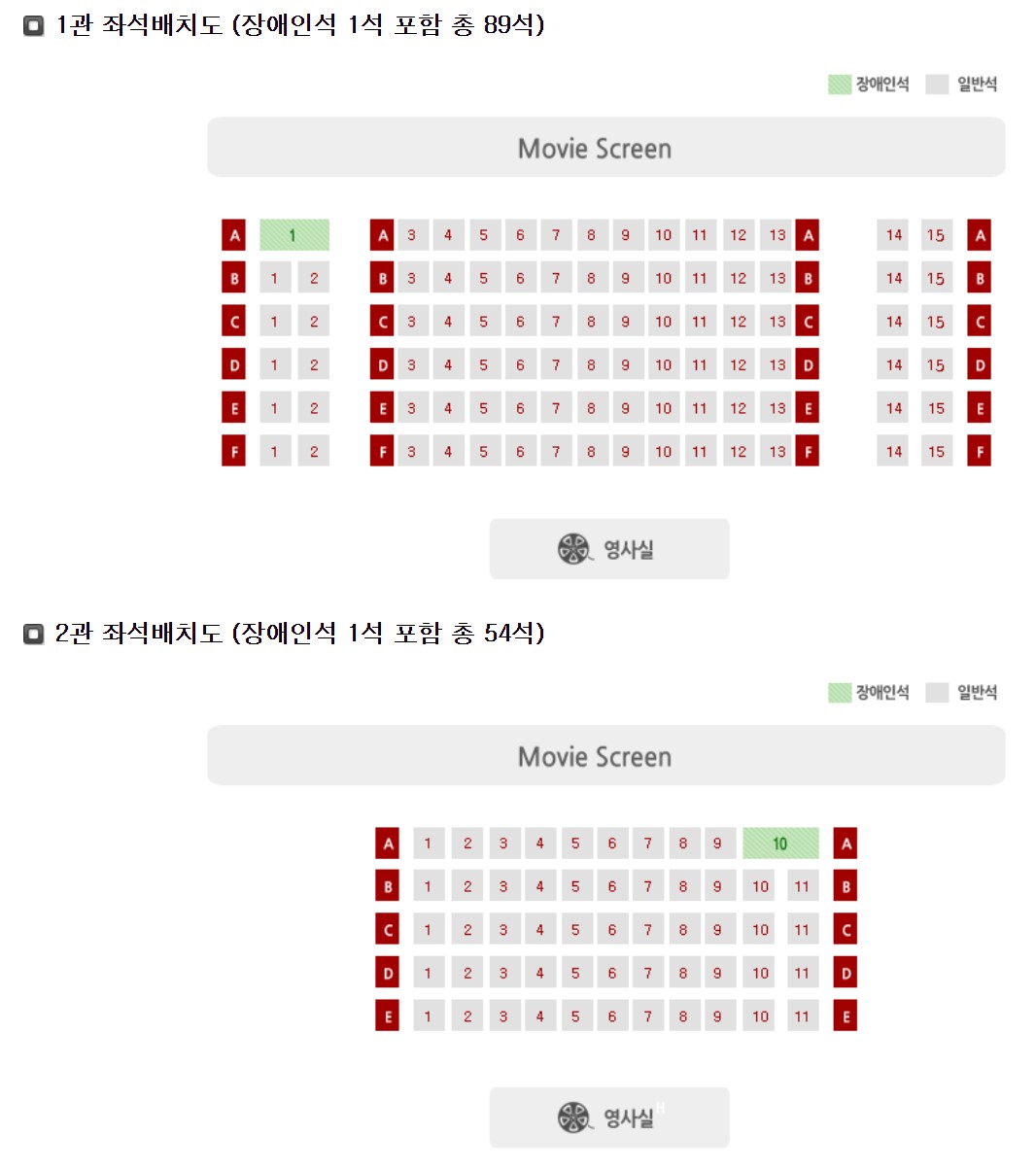 1관, 2관이 있으며 각각 89석, 54석이며 영화 예매는 고흥 작은 영화관 홈페이지(https://cinema.goheung.go.kr)에서 할 수 있으며 빠른 예매도 할 수 있습니다.