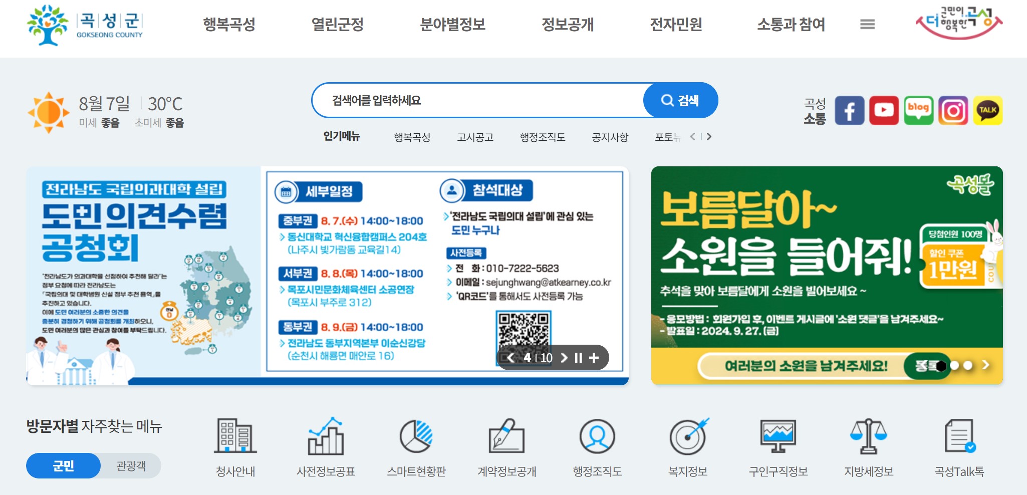 곡성군청 홈페이지에는 군민들과 소통하고, 지역사회 발전을 도모하기 위한 온라인 공간입니다. 곡성군의 다양한 소식, 행정정보를 쉽게 접할 수 있으며, 각종 민원 서비스 및 공공정보를 편리하게 이용할 수 있습니다.