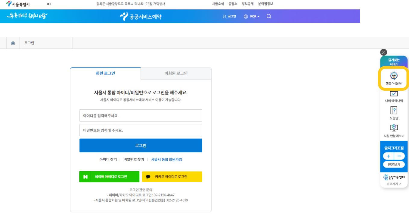 공공서비스예약 홈페이지 이용 시 문의사항은 홈페이지 상단 이용안내 메뉴에서 자주 묻는 질문을 확인하는 방법과 홈페이지 첫 화면 우측에서 챗봇 '서울톡' 또는 02) 120 (휴일, 야간) 상담원 연결 서비스를 이용하는 방법이 있습니다.