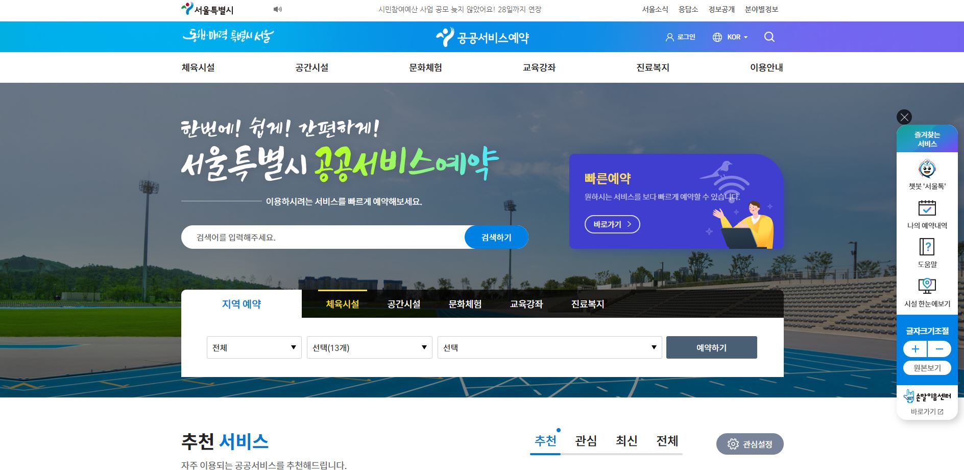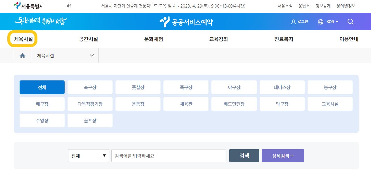 이곳에서 이용 가능한 서비스에는 체육시설, 공간시설, 문화체험, 교육강좌, 진료복지 예약 서비스입니다. 공공서비스예약 서울특별시 홈페이지 첫 화면 상단에서 관심분야 터치 시 해당 시설 및 강좌 목록 확인이 가능합니다. 예를 들어 체육시설 터치 시 예약 가능한 체육시설을 전체 보기 할 수 있습니다.
