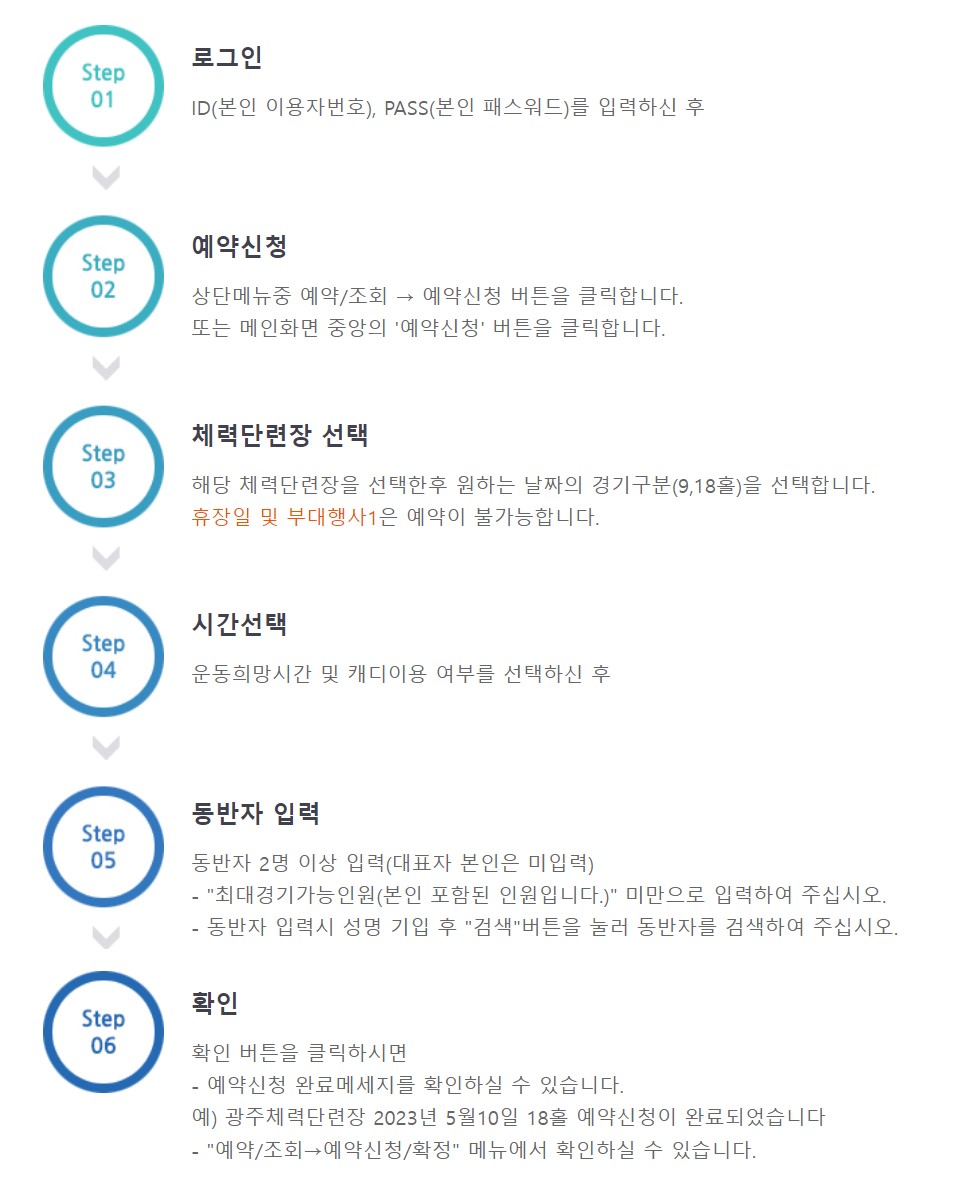 06. 확인 버튼 터치, 예약 신청 완료메시지 확인 가능 예) 광주체력단련장 2023년 5월 10일 18홀 예약신청 완료
