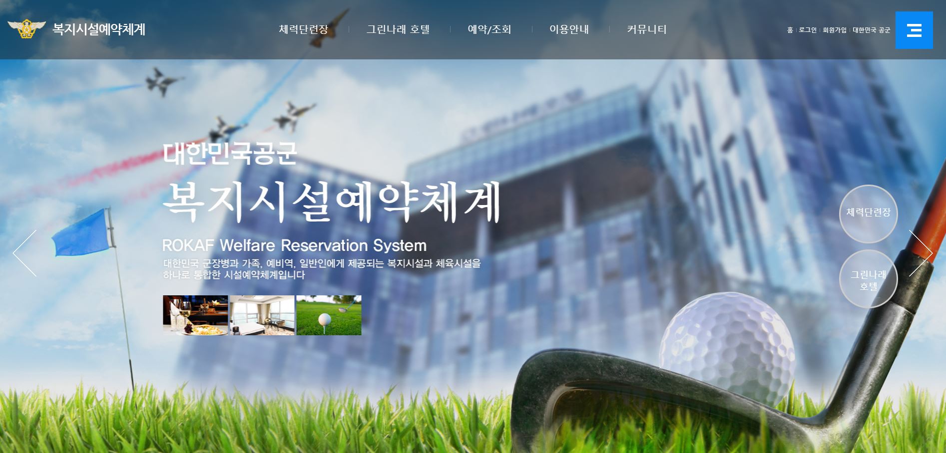 아래와 같이 공군 복지시설 예약체계에 접속하면 홈페이지 첫화면을 만나볼 수 있습니다.