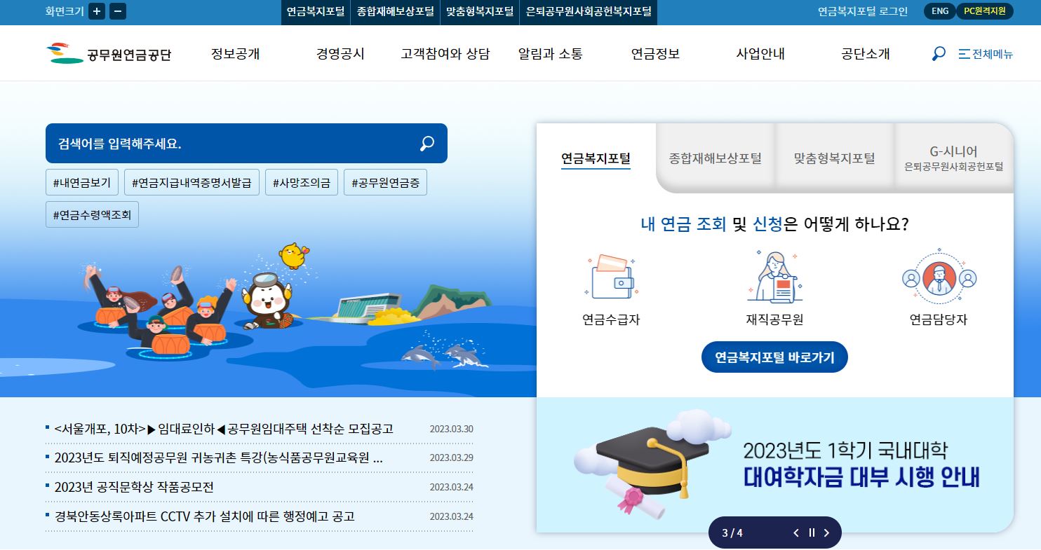 공무원연금공담 홈페이지 내 연금복지포털에서는 연금업무를 쉽고 편리하게 볼 수 있습니다.