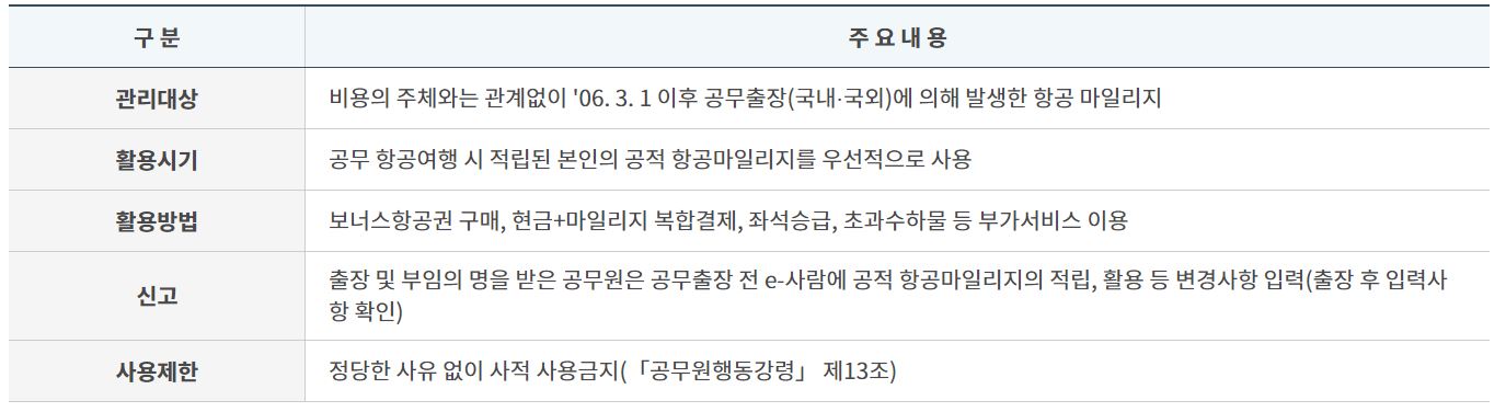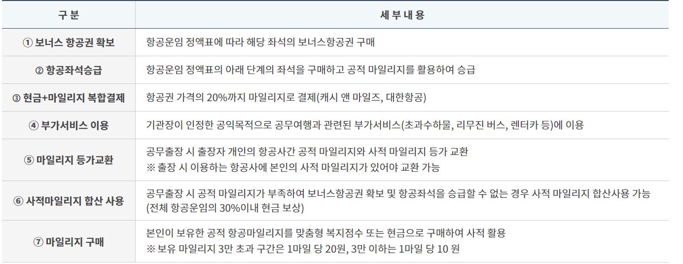 5. 사적마일리지 합산 사용- 공무 출장시 사적 마일리지와 합산하여 사용 가능(보너스항공권 또는 항공좌석 승급의 경우에 한함)