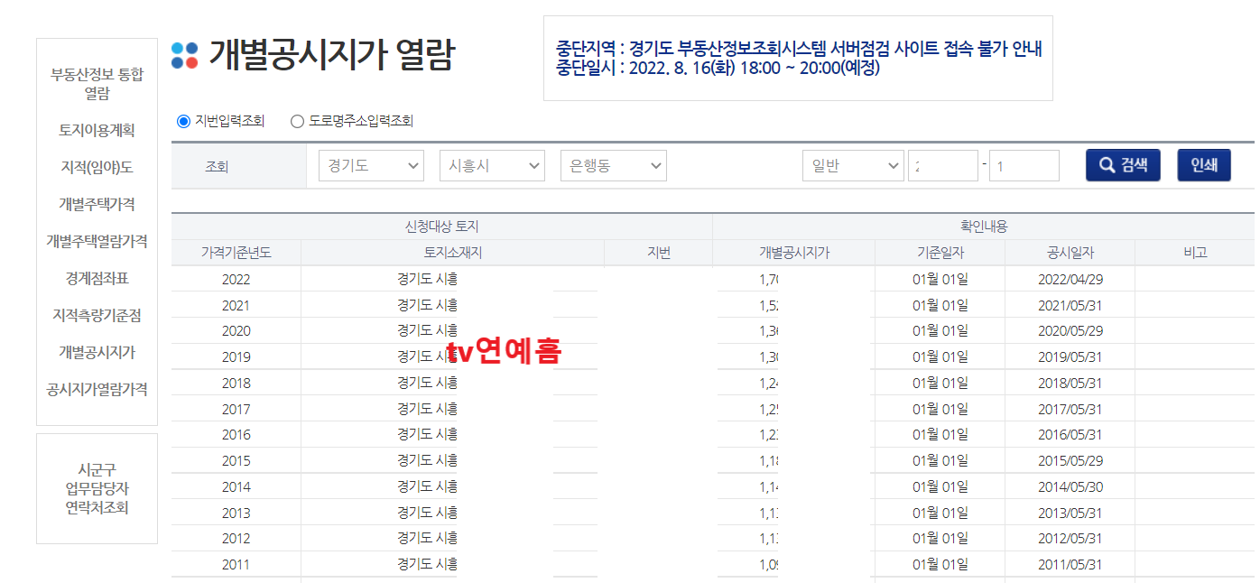 4. 임의로 경기도 시흥시의 한 토지의 공시지가를 검색해봅니다. 아래처럼 년도별로 개별공시지가가 나오는것을 확인할수 있습니다.