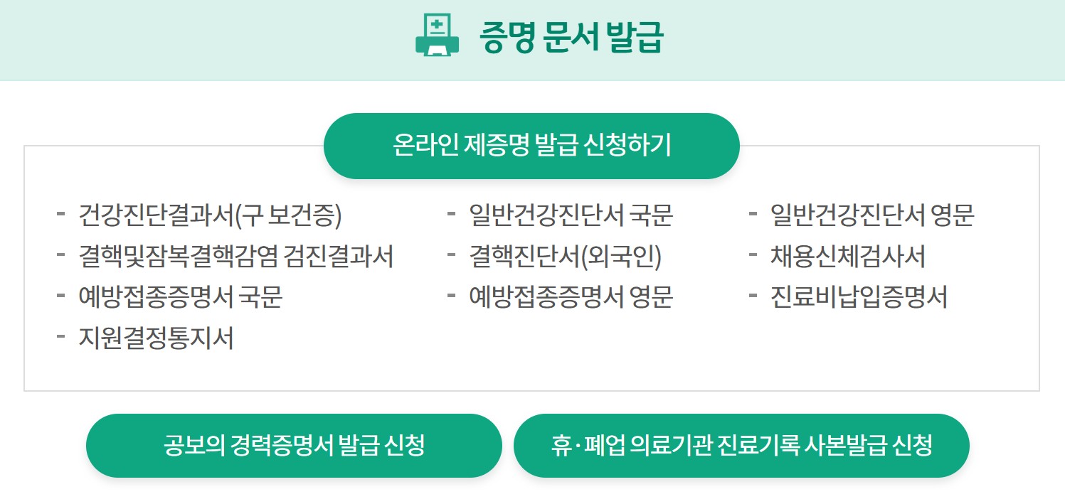 발급할 수 있는 문서에는 건강진단결과서(구 보건증), 일반건강진단서, 결핵 및 잠복결핵감염 건강진단서, 결핵진단서(외국인), 채용신체검사서, 예방접종증명서, 진료비납입증명서, 지원결정통지서, 공보의 경력증명서 발급, 휴폐업 의료기관 진료기록 사본발급 등이 있다.