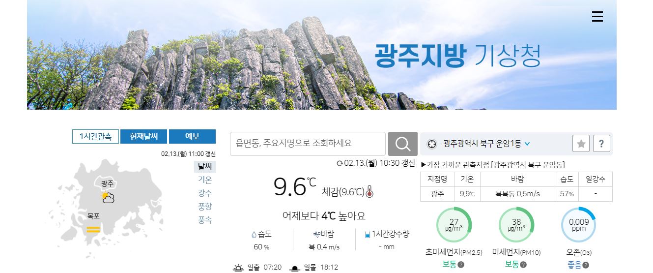 광주지방기상청에는 산악기상정보가 있는데 무등산 월출산의 날씨, 기온, 체감온도 등을 알려주고 있으며 무등산 및 월출산 주요지점인 중심사 입구 등의 결빌 가능성을 알려줍니다. 무등산 월출산의 산악기상정보 확인방법은 광주지방기상청 홈페이지에서 하단에 위치하고 있으니 필요하신분은 하단의 광주지방기상청 홈페이지 바로가기에서 확인하시기 바랍니다.