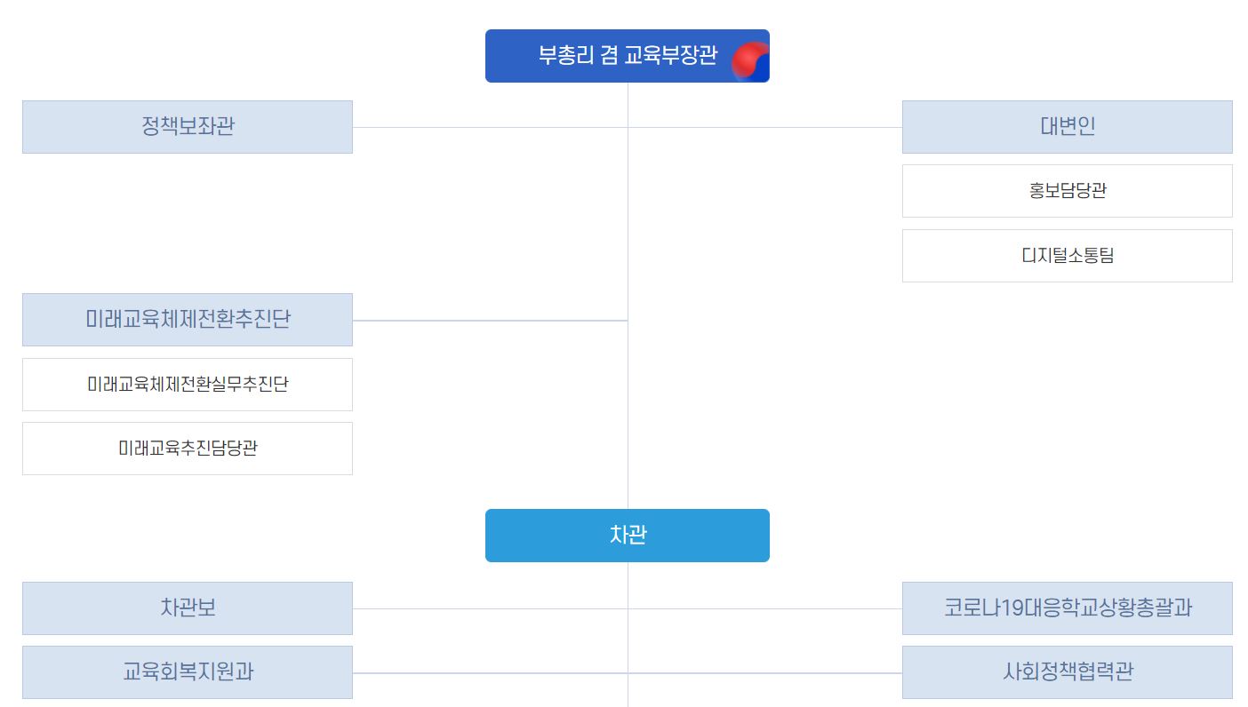 교육부 조직도를 살펴보면 교육부의 전체 흐름을 볼 수 있습니다. 부총리 그리고 교육부 장관을 중심으로 정책보좌관과 대변인 그리고 다양한 교육부의 조직을 볼 수 있습니다. 더 자세하게 보고 싶으면 아래 교육부 조직도 바로가기를 이용하시면 됩니다.
