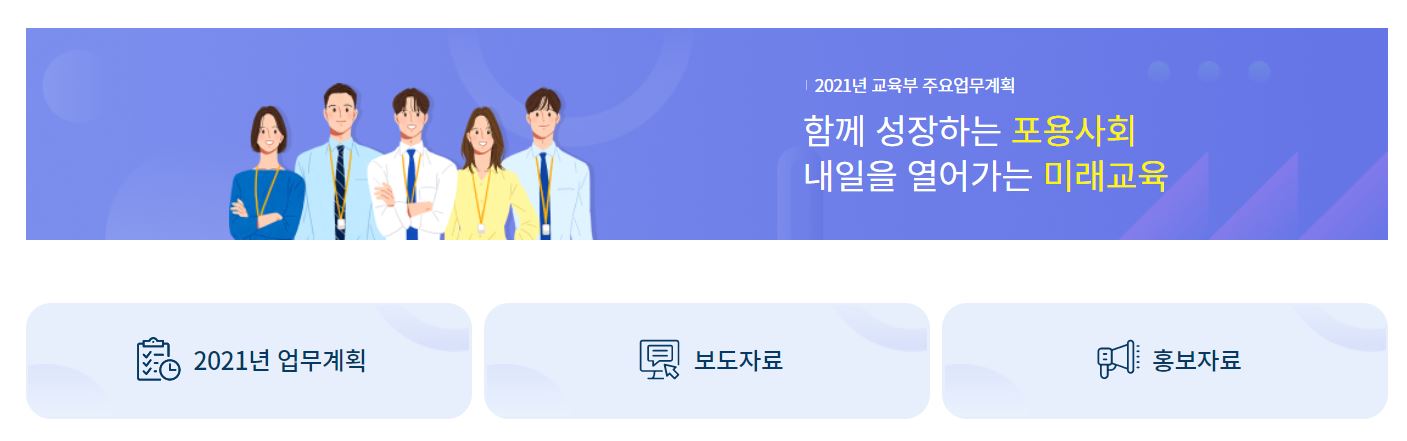 교육부의 역할은 각해마다 발행되는 업무계획을 살펴봐야 합니다. 각해의 업무계획에는 교육 업무추진계획과 방향 그리고 핵심 추진과제에 대해 상세하게 안내합니다.