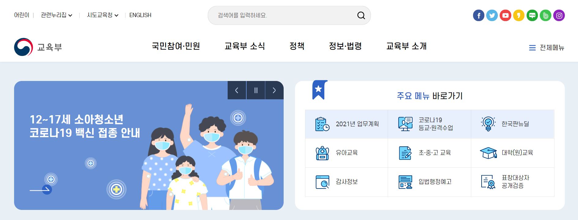 교육부 홈페이지는 포털 검색창에서 교육부를 입력하면 주소가 바로 나옵니다.