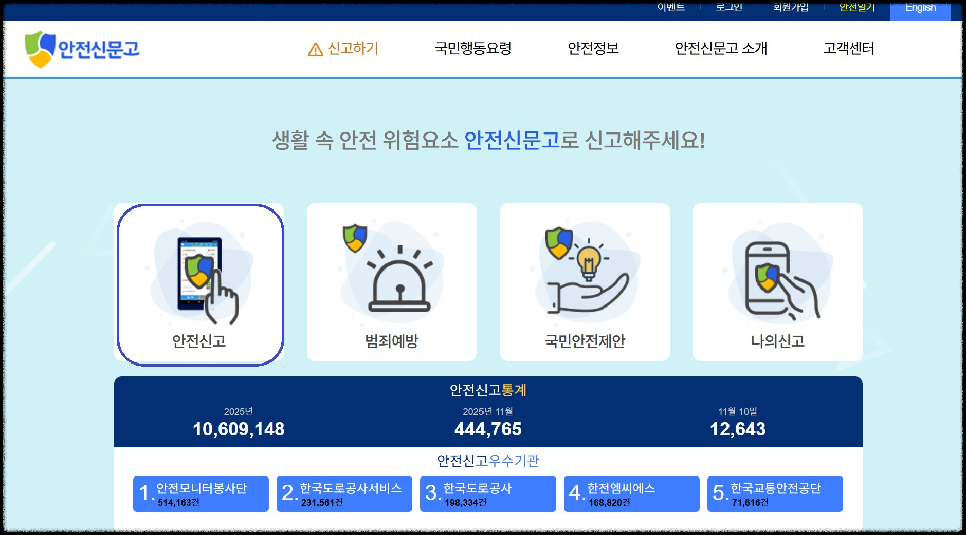 다음으로 알아볼 방법은 안전신문고를 통해 신고하는 방법이에요. 안전신문고는 교통보다는 교통 외의 분야를 신고할 때 이용할 수 있어요. 안전신문고 홈페이지에 접속하면 '안전신고'페이지가 있어요. 여기에서 바로 신고할 수 있어요.