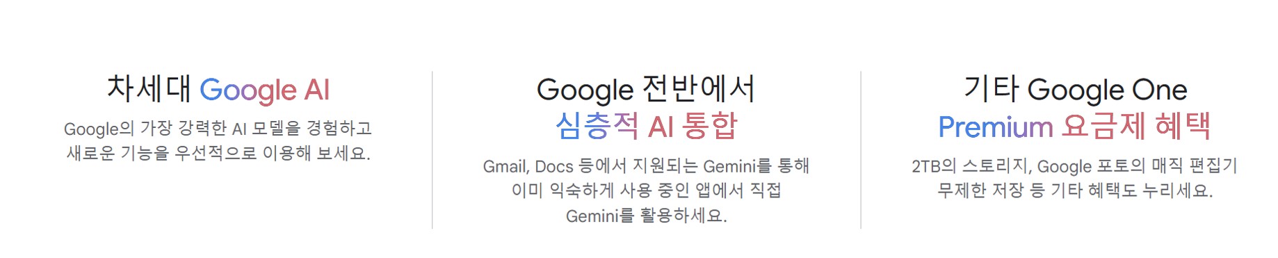 개인 Google 계정만 AI Premium 요금제에 가입할 수 있습니다. Workspace 고객은 기존 구독의 Gemini 부가기능에 가입할 수 있습니다. 나와 내 비즈니스에 맞는 서비스에 대해 자세히 알아보세요.