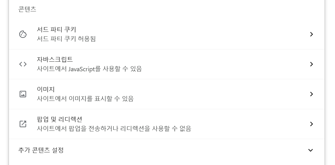 1) 개인정보 보호 및 보안 클릭 후 사이트 설정 확인