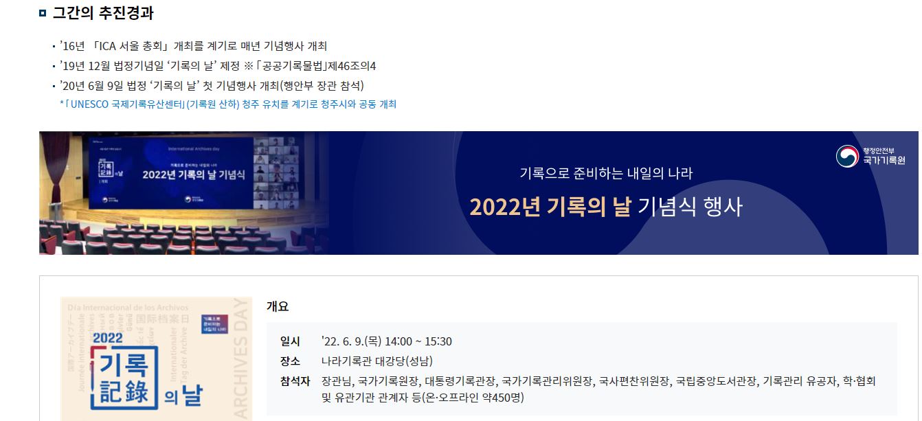 기록의 중요성 인식을 확산하고자 ICA(세계기록관리협의회)는 매년 6월 9일을 세계기록의 날로 지정하였습니다. 이를 계기로 프랑스, 독일, 일본, 중국 등 다수국이 기록의 날을 지정하여 행사를 개최하고 있으며 우리나라도 세계기록유산 보유건수 세계 4위 국가로 해당일을 기록의 날로 지정하고 기념하고 있습니다.