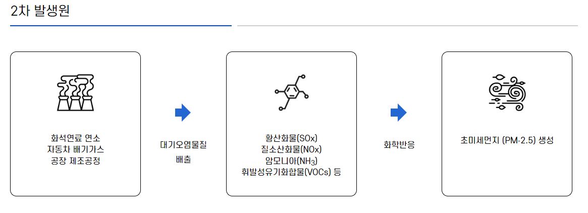 국가미세먼지정보센터에서 수집한 자료를 토대로 미세먼지 발생원을 조사한 결과 미세먼지 발생원은 자연적 발생원인 흙먼지, 바닷물에서 생기는 소금,식물의 꽃가루 등 혹은 인위적 발생원인 화석연료를 발생할때 생기는 매연, 자동차 배기가스, 건설현장에서 발생하는 날림먼지, 공장 내 분말형태의 원자재, 부자재 취급공정에서의 가루성분, 소각장 연기 등이 해당합니다. 미세먼지 성분구성은 지역, 계절, 기상조건 등에 따라 달라질 수 있으며 여러 오염물질이 공기중에서 화학반응을 일으켜 형성된 덩어리, 화석연료를 사용하는 과정에서 발생한 탄소류나 검댕 지표면 흙먼지 등에서 생기는 광물등으로 구성됩니다.