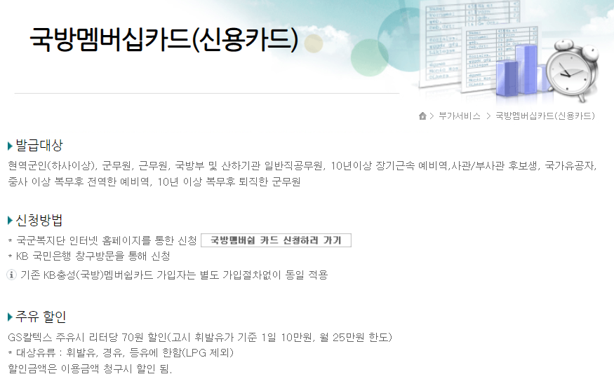 국방 멤버십 카드라 하여 주유할인도 받고 국군복지단과 군 운영 휴양시설 그리고 체력단련장 이용요금할인을 받을 수 있는 것도 국군 복지포털 홈페이지에서 확인 및 발급 가능합니다.