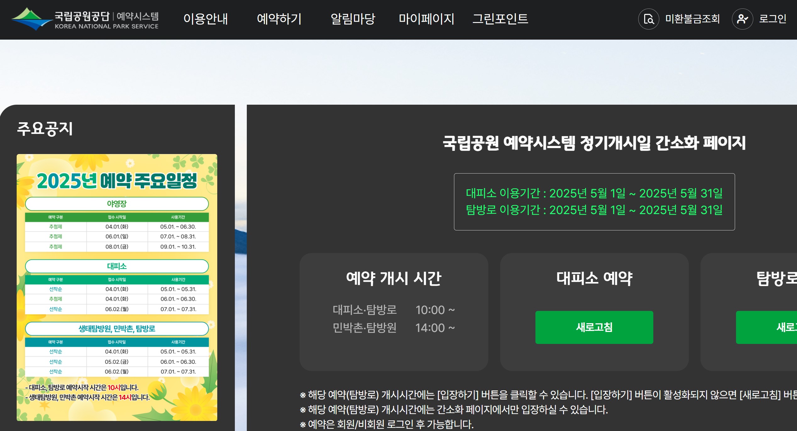 국립공원 예약시스템 정기개시일 간소화 페이지 대피소 이용기간 : 2025년 5월 1일 ~ 2025년 5월 31일 탐방로 이용기간 : 2025년 5월 1일 ~ 2025년 5월 31일 예약 개시 시간 대피소·탐방로 10:00 ~ 민박촌·