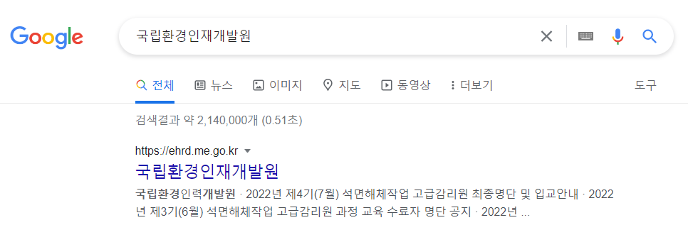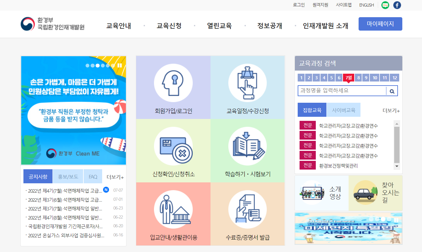 환경부 산하 국립환경인재개발원 홈페이지는 포털에 "국립환경인재개발원" 이라고 입력하면 주소가 나옵니다. 환경부 국립환경인재개발원 홈페이지 (https://ehrd.me.go.kr/kor/index.do) 바로가기