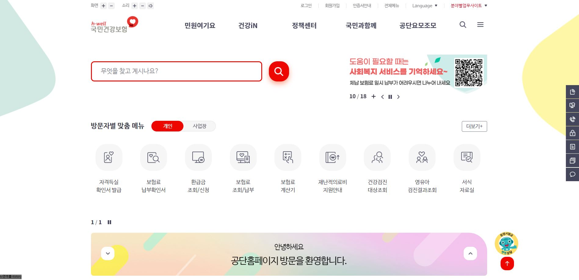 국민건강보험공단 홈페이지 첫 화면에서 스크롤을 아래로 내려 홈페이지 첫 화면 하단으로 이동합니다.