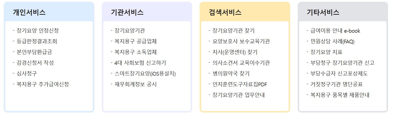 이 밖에도 기관을 위한 복지용구 공급업체, 소독업체, 4대 사회보험 신고하기, 스마트장기요양(iOS용 설치) 등이 있습니다.