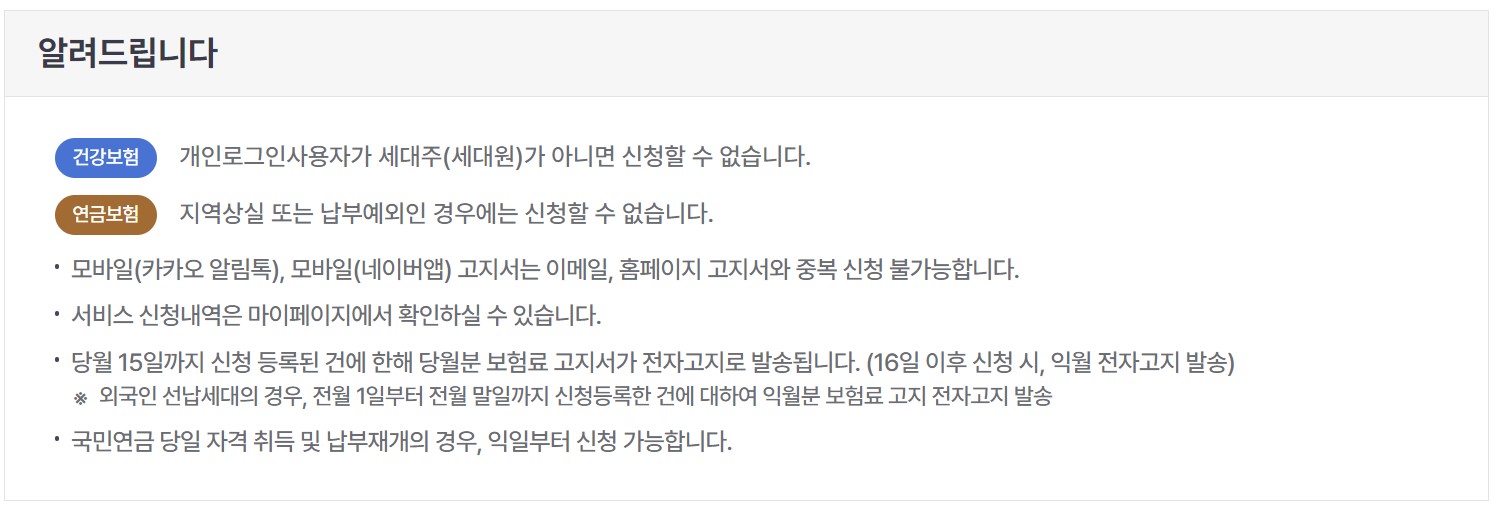 1. 건강보험: 개인로그인 사용자가 세대주(세대원)가 아니면 신청할 수 없습니다.