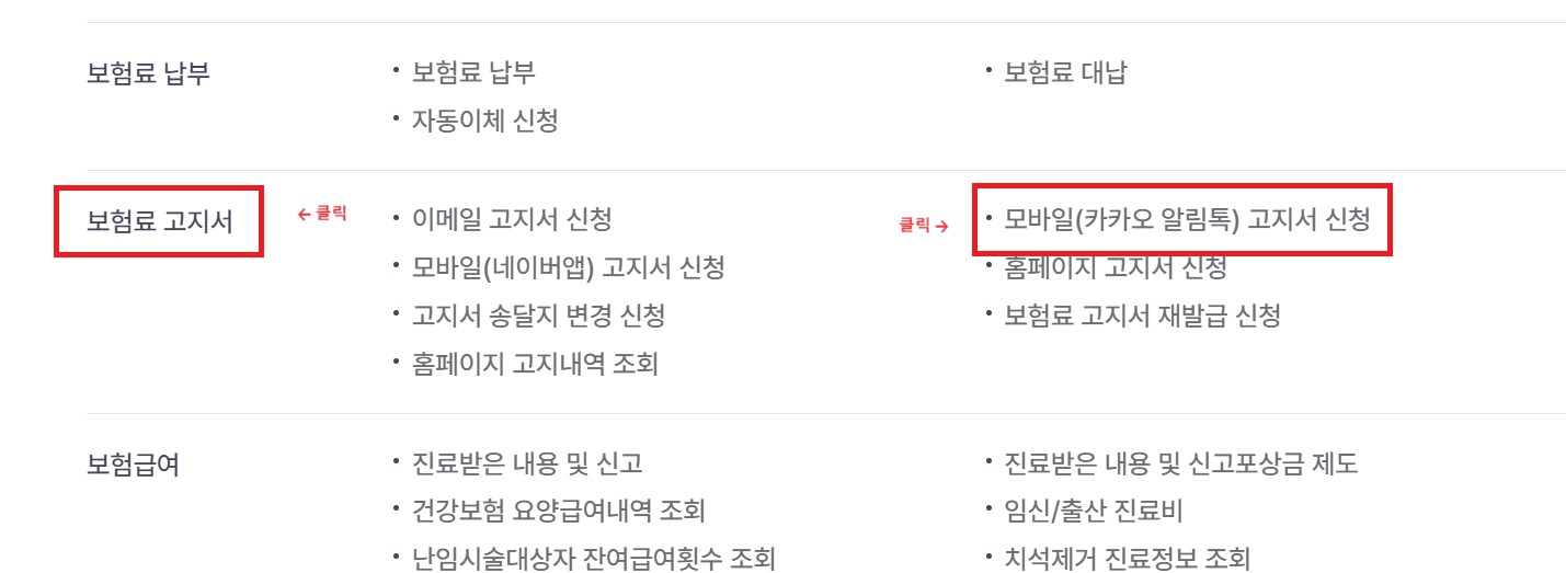 3. 메뉴에서 보험료 고지서 - 모바일(카카오 알림톡) 고지서 신청을 순서대로 클릭합니다.