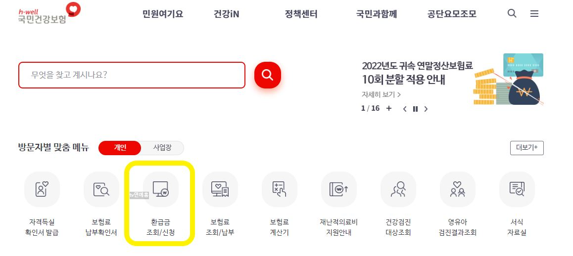 2. 국민건강보험공단 홈페이지 첫 화면은 아래와 같으며 방문자별맞춤메뉴> 환급금조회/신청 순으로 접근합니다.