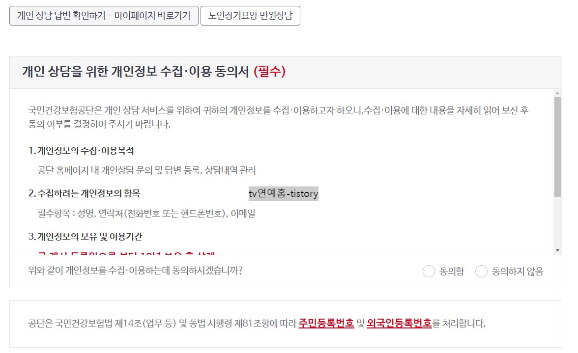 개인 상담 답변 확인은 국민건강보험공단 홈페이지> 마이페이지에서 확인 가능합니다.