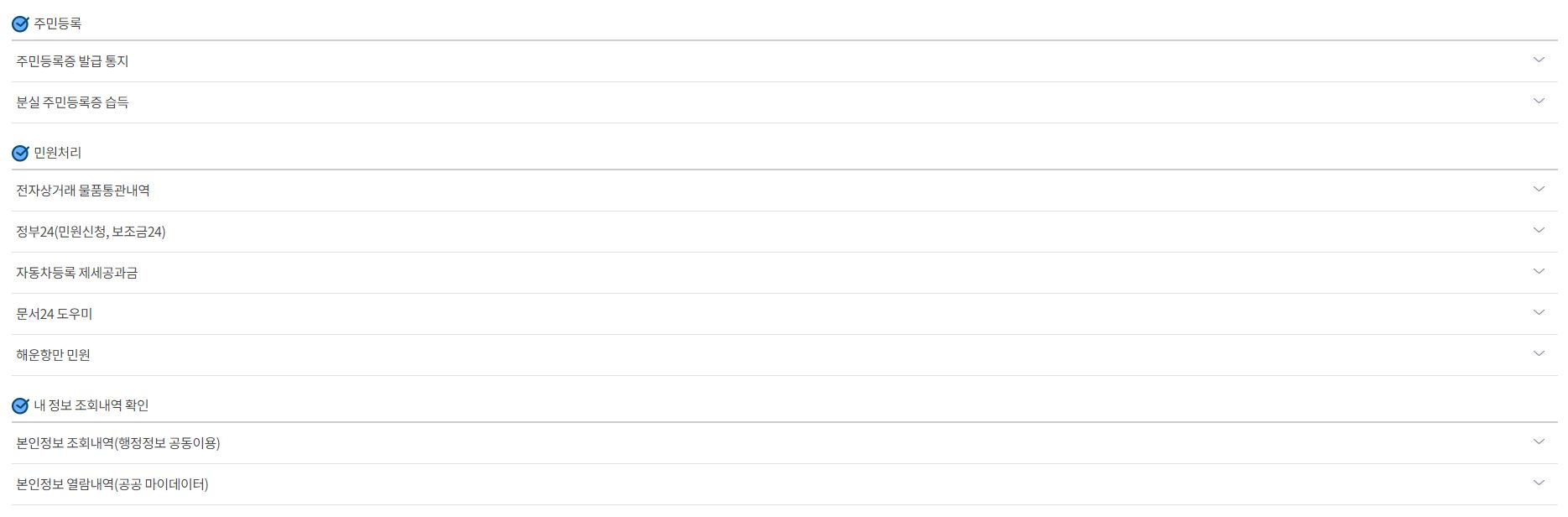 국민비서 구삐 알림서비스 안내: 건강검진, 전기요금, 주택임대차, 국세고지서, 휴면예금, 국민연금 청구안내, 4대 보험 가입, 개인지방소득세 신고 및 납부 안내, 주민등록증 발급 통지, 분실 주민등록증 습득, 전자상거래 물품통관내역, 정부 24(민원신청, 보조금 24), 자동차등록 제세공과금, 문서 24 도우미, 해운항만 민원, 본인정보 조회내역(행정정보 공동이용), 본인정보 열람 내역(공공 마이데이터), 유치원 입학(처음학교로), 취업 후 상환 학자금대출 승인, 학자금 중복지원금 반환, 1365 자원봉사, 청소년 봉사활동, 운전면서 적성검사 갱신, 내 차 정보 변경(자동차 365), 자동차검사, 자동차의무보험 만기, 교통범칙금 납부 기한, 교통과태료 납부기한, 선박용 물건 형식승인 갱신, 국가공무원 공개경쟁채용시험, 항공종사자 자격시험, 어린이 통학버스 운전자 교육, 고령운전자 교육, 민간자격 보수교육, 제주 운수종사자 보수교육, 교통안전담당자 보수교육, 범죄경력회보서 발급, 세움터 민원, 코로나19 접종예약