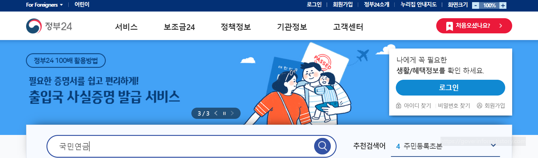 2) 정부24 홈페이지 첫화면 검색창에 "국민연금"을 입력하고 검색한다.