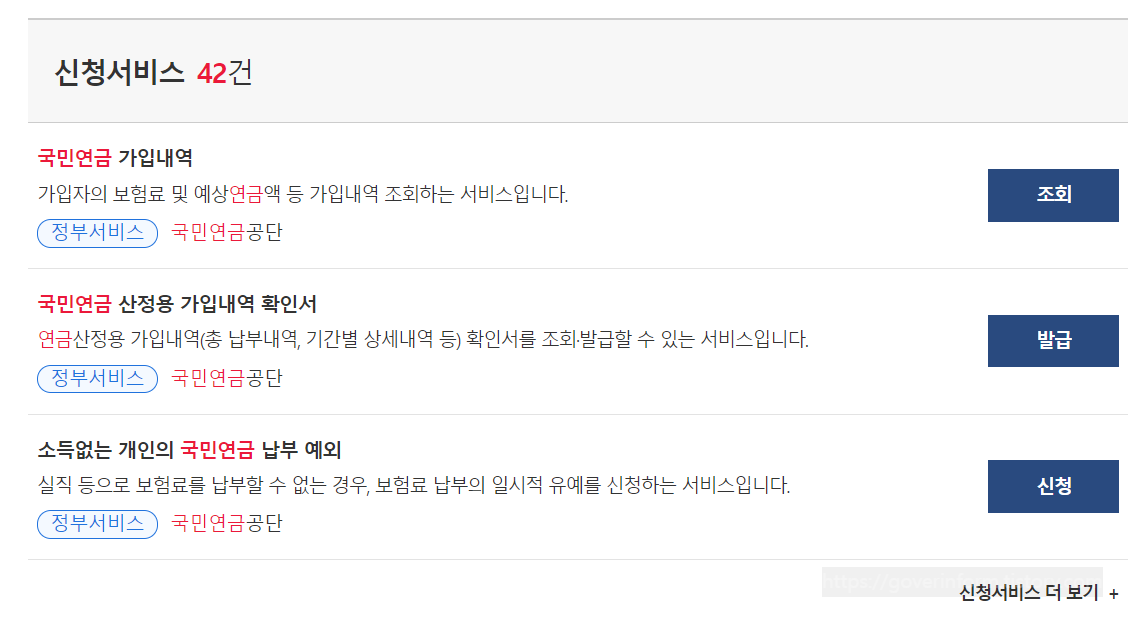 3) 검색결과가 다음과 같이 나오는데, 가장 위에 있는 국민연금 가입내역을 조회한다.