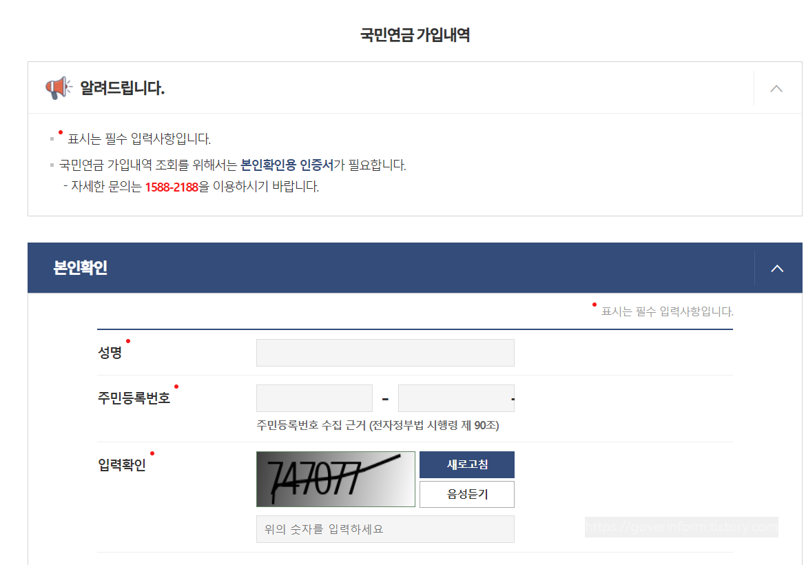 5) 위의 사항을 입력한 후에 하단에 있는 본인확인 버튼을 터치하면 국민연금 가입여부를 확인할 수 있다.