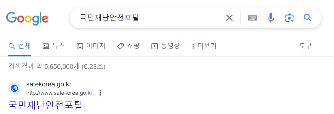 구글 검색창에 "국민재난안전포털"이라고 입력하고 검색하면 주소(https://www.safekorea.go.kr)가 나옵니다. 여기에 접근하면 국민재난안전포털 홈페이지 이용이 가능합니다.