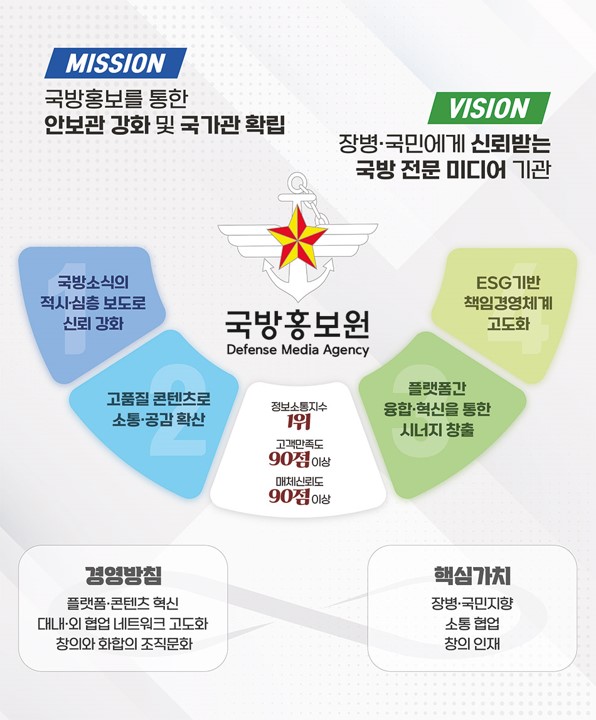 국방홍보원은 군 장병과 국민들에게 국방정책과 군 활동을 정확하게 전달하여 군, 국민에게 신뢰를 받고 사랑을 받는 국방홍보기관입니다. 국방홍보매체인 국군방송과 국방일보를 통해 국민과 장병의 안보이식을 제고하고 국방 관련 소식을 제공합니다.