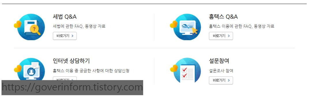 국세청홈택스 홈페이지 고객센터에는 다음과 같이 네 가지 고객센터 서비스를 제공하고 있다. Q&A는 세법이나 홈택스 이용에 대한 자주 찾는 질문 또는 동영상 자료를 제공하고 있으며 상담 신청은 인터넷 상담하기를 이용하면 된다. 설문조사는 부가가치세, 양도세 등 서비스 이용에 대한 만족도 조사로 요구사항 수렴 후 홈택스 시스템 개선에 반영하고 있다.