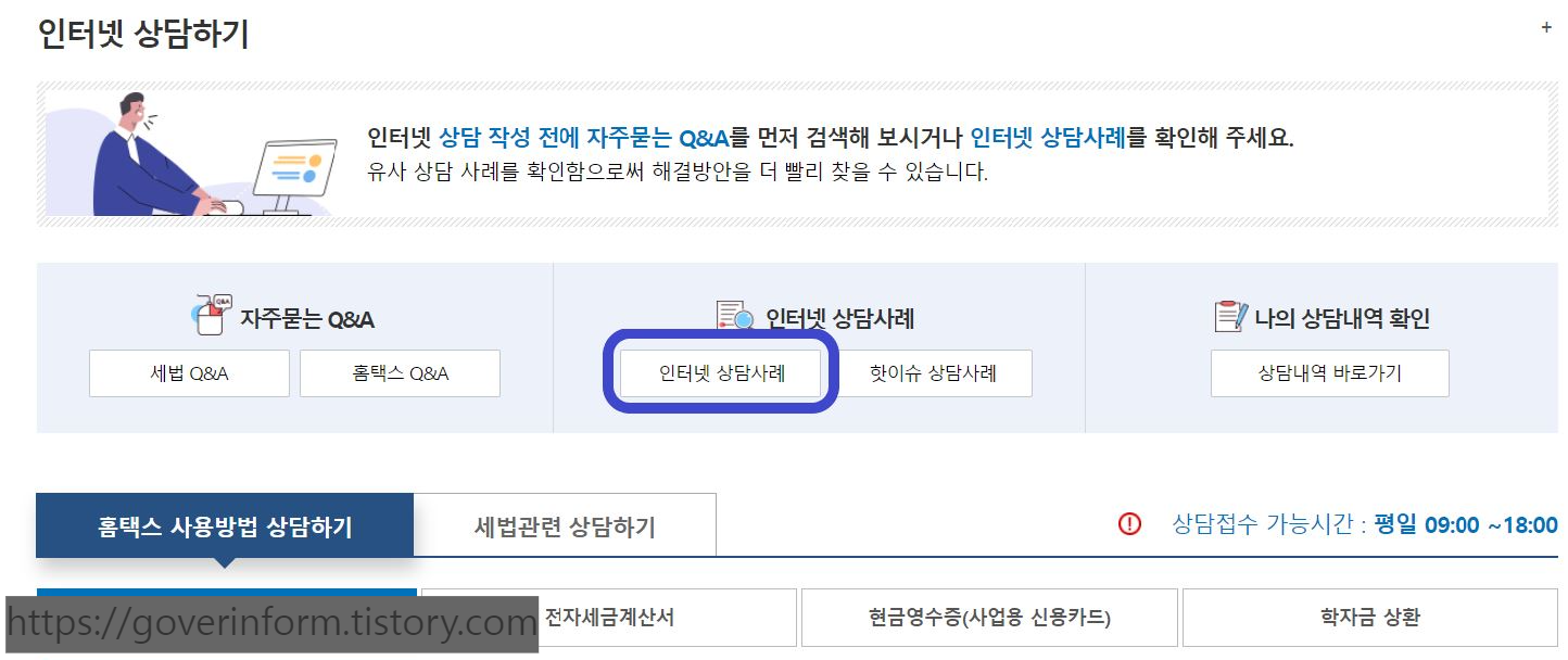 상담접수 가능시간은 평일 09:00~18:00이며 인터넷 상담하기는 세법이나 홈택스 사용방법에 대해 궁금한 사항이 있는 경우 상담을 신청하는 화면으로 신청할 때 작성한 이메일로 답변을 주는 서비스이다. 국세청홈택스 고객센터 전화번호는 국번 없이 126이다. 상담시간은 상담접수 가능시간과 동일하다.