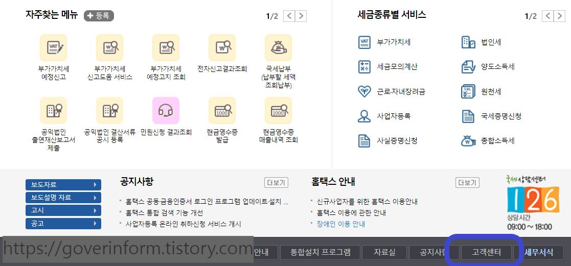 국세청홈택스 홈페이지 하단에 보면 '고객센터' 메뉴가 있다. 여기에 접근한다.