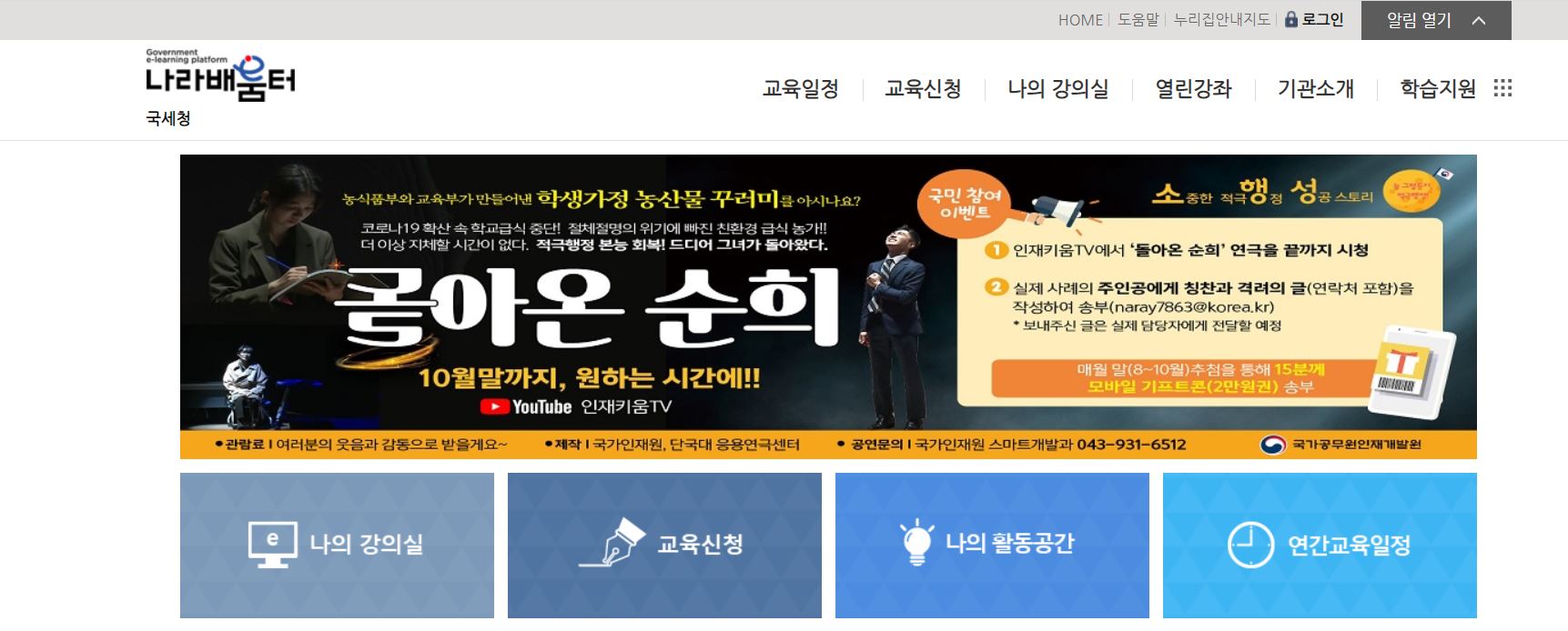 국세청 나라배움터 홈페이지 첫화면입니다.