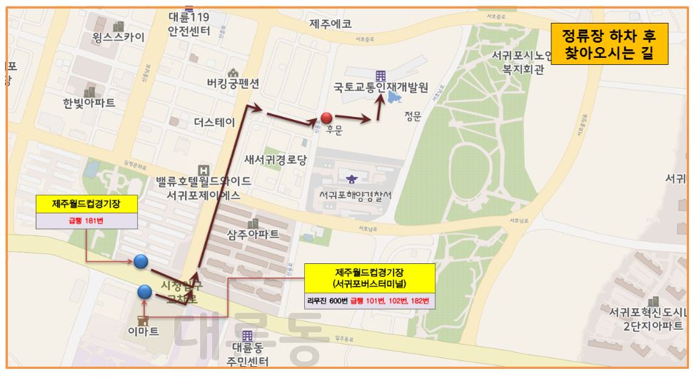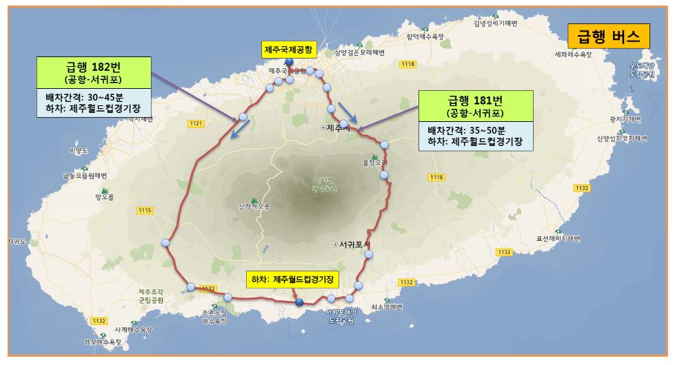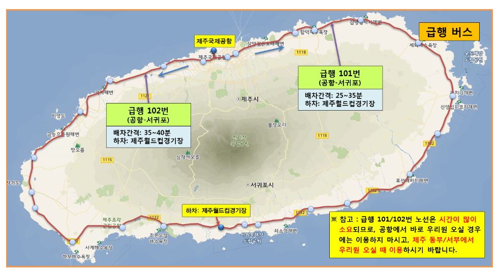 급행버스이용방법은 제주공항 1층 5번게이트에서 급행버스 181번 또는 182번 버스를 탑승하여 제주월드컵경기장에 하차하면 1시간 내외가 소요됩니다. 급행버스 101번이나 102번도 탑승가능하나 시간이 2시간 소요되므로 제주동부나 서부지역에서 오는 경우에 이용하면 편리합니다. 급행버스하차후 도보이용방법은 하단의 지도를 참고하시기 바랍니다.