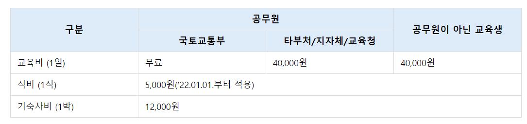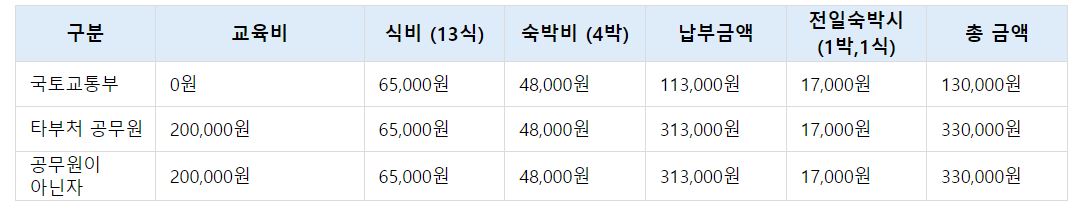 집합교육 및 이러닝과정 교육비는 다음과 같습니다. 전일 생활관 이용 시 전일 숙박비 및 교육시작일 조식비용을 납부해야 하며 비숙박자는 교육비나 중식비(5식)를 내야 하며 이러닝과정은 교육비가 없습니다. 납입 후 영수증은 교육과정장이 교육기관 중 목요일 오후에 개별 배포합니다.