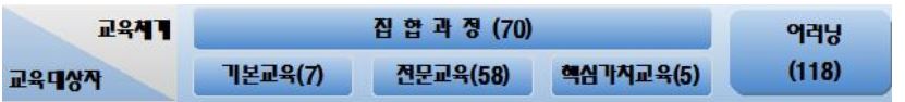 국토교통인재개발원 교육운영체계는 하단과 같으며 집합과정 70개와 이러닝 118개 과정으로 되어있습니다. 집합과정에는 기본교육 7개, 전문교육 58개, 핵심가치교육 5개가 있으며 집합과정과 이러닝과정은 교육대상자에 따라 교육과목이 상이합니다.