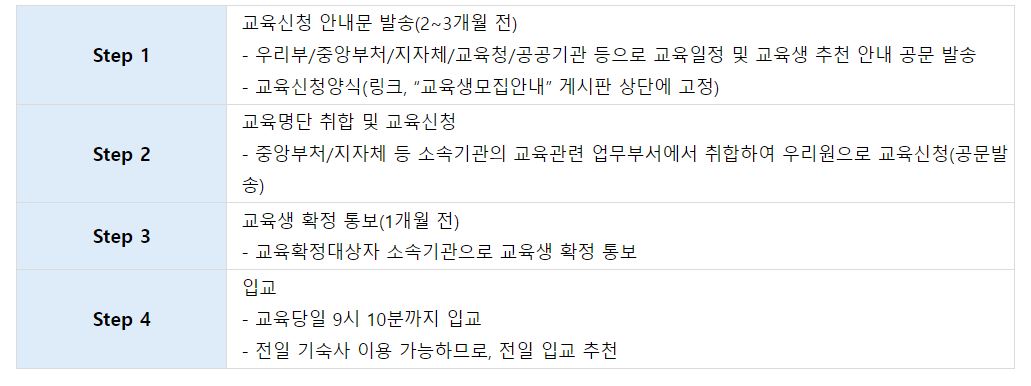 집합교육 신청절차는 4단계로 이루어져있으며 지정된 기일까지 공문으로 접수하며 신청인원이 계획인원을 초과하는 경우 기관별로 안배하여 선발하며 통보된 대상자가 교육에 불참 시 최소 7일 전에 취소나 교체명단을 공문으로 보내야 합니다. 민간기업 등에서 팩스나 우편으로 신청한 경우에는 국토교통인재개발원에 전화로 수신여부 확인을 해야 합니다.