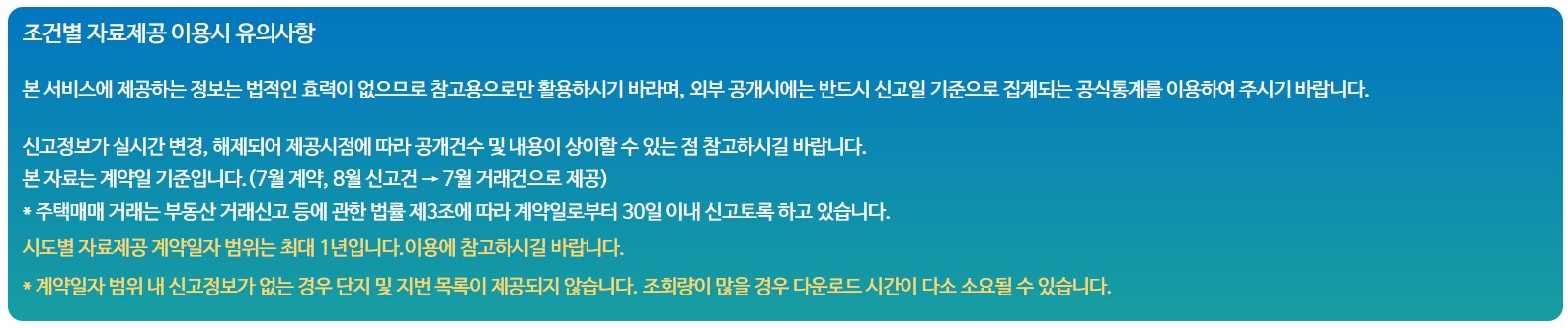 * 계약일자 범위 내 신고정보가 없는 경우 단지, 지번 목록이 제공되지 않습니다. 조회량이 많은 경우 다운로드 시간이 다소 소요됩니다.