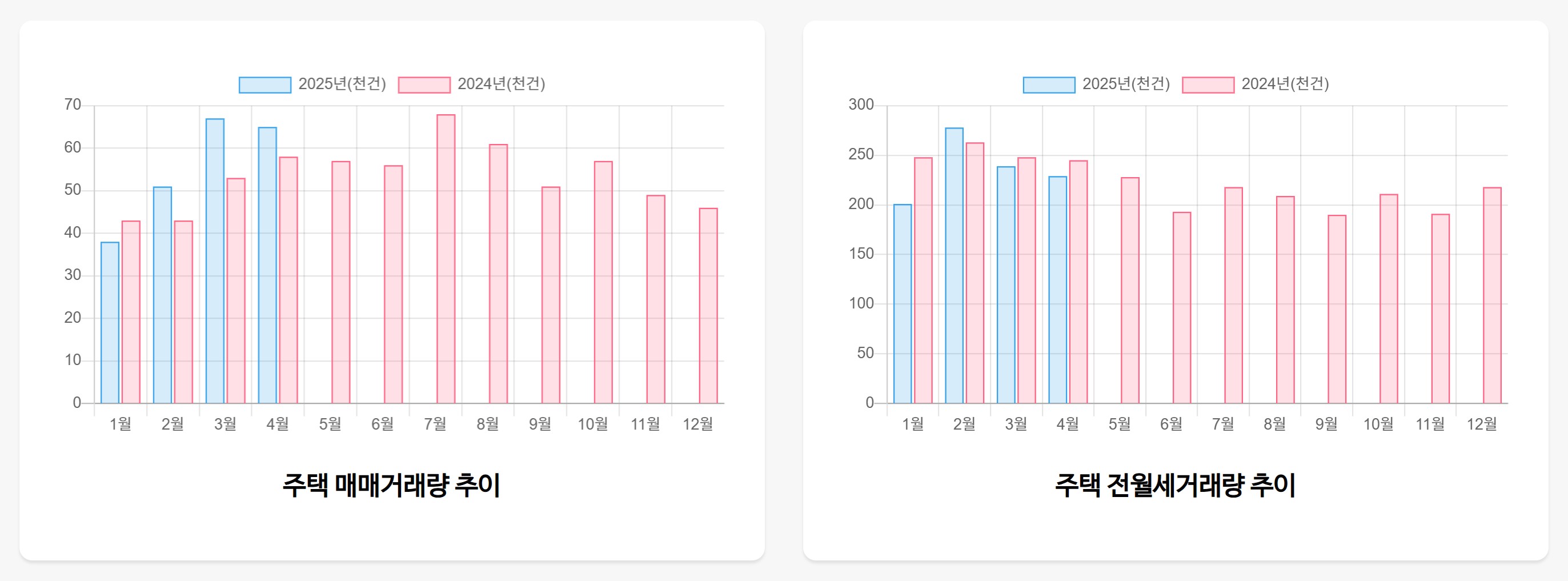 국토교통부 실거래가 공개시스템 홈페이지 메인화면에서 스크롤을 내리면 전년도와 올해의 주택 매매거래량 및 전월세거래량 추이를 볼 수 있습니다. 붉은색이 전년도, 푸른색이 올해입니다.