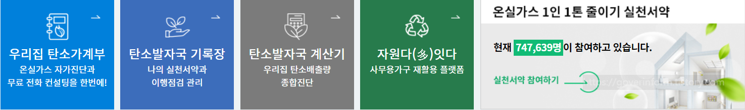 온실가스 자가진단, 무료 전화컨설팅이 있습니다. 컨설팅을 홈페이지에 신청하면 컨설팅을 받게 되고 감축활동을 3개월간 이행하면 컨서팅 결과를 확인할 수 있습니다. 자세한건 그린스타트 홈페이지 첫화면 하단에서 우리집 탄소가계부를 참고하시기 바랍니다.