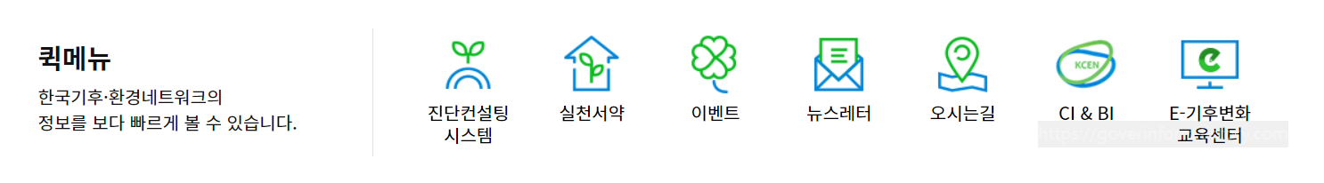 진단컨설팅시스템, 실천서약, 이벤트, 뉴스레터, 그린스타트(한국기후환경네트워크)주소, 찾아가는방법, E-기후변화 교육센터 바로가기가 있습니다.