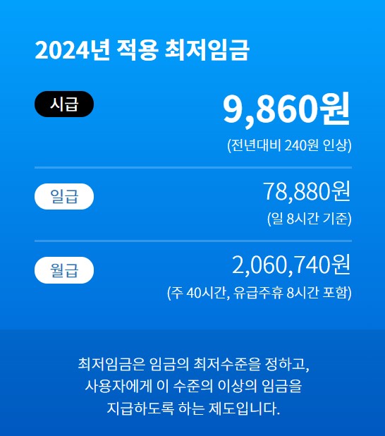 최저임금은 2024년 기준 시간급 9,860원으로 일급으로 환산 시 78,880원(8시간 기준), 월급 환산 시 2,060,740원(주 40시간 기준)입니다.
