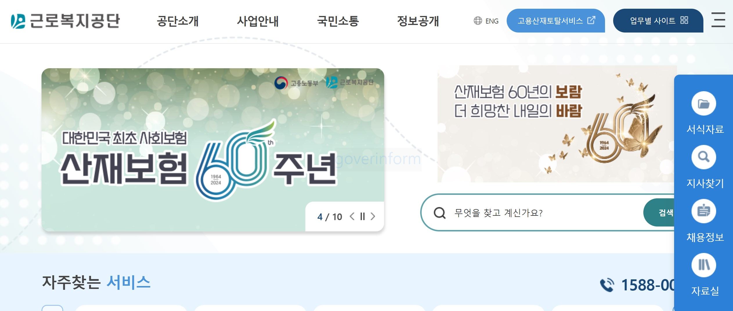 가장 빠르고 정확한 방법은 근로복지공단 홈페이지에 접근하는 것입니다. 아래 근로복지공단 홈페이지 링크를 이용하거나 직접 홈페이지에서 '근로복지공단'을 검색해서 접근하면 됩니다.